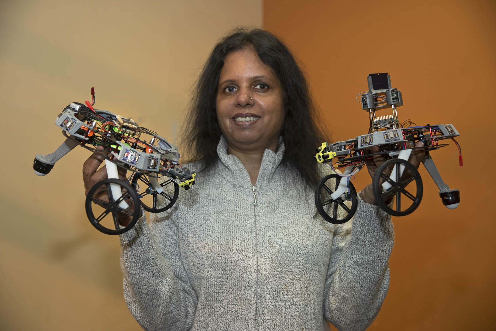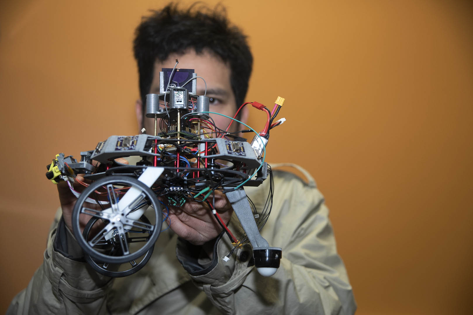Save for the wiring of the antenna towers (seen in the version held by Anu Srinivasan - director of the Silicon Technology Prototyping Lab at the time), I designed, wired, and assembled all of the bots that were delivered to the Intel Labs team in Guadalajara and Mukesh Bhartiya's team in India.